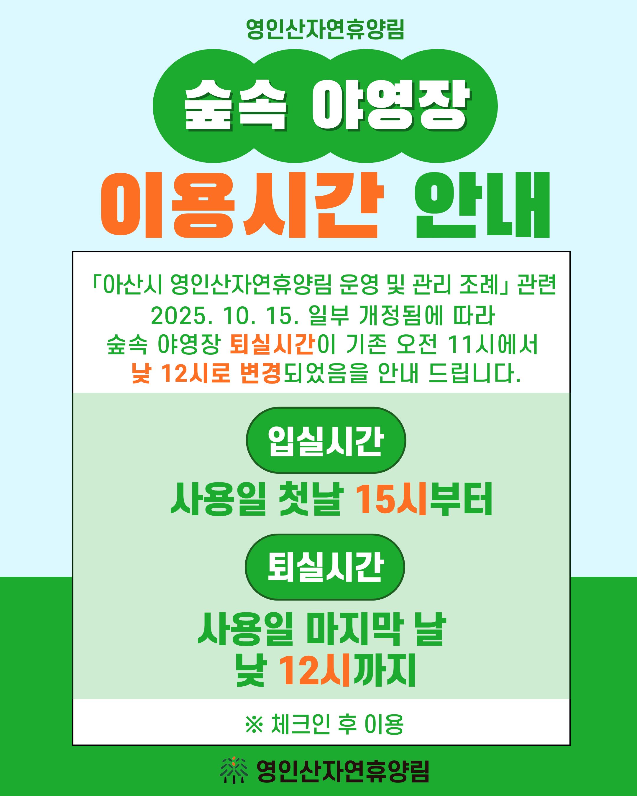 숲속 야영장 퇴실시간이 기존 오전 11시에서 낮 12시로 변경되었음을 안내 드립니다.